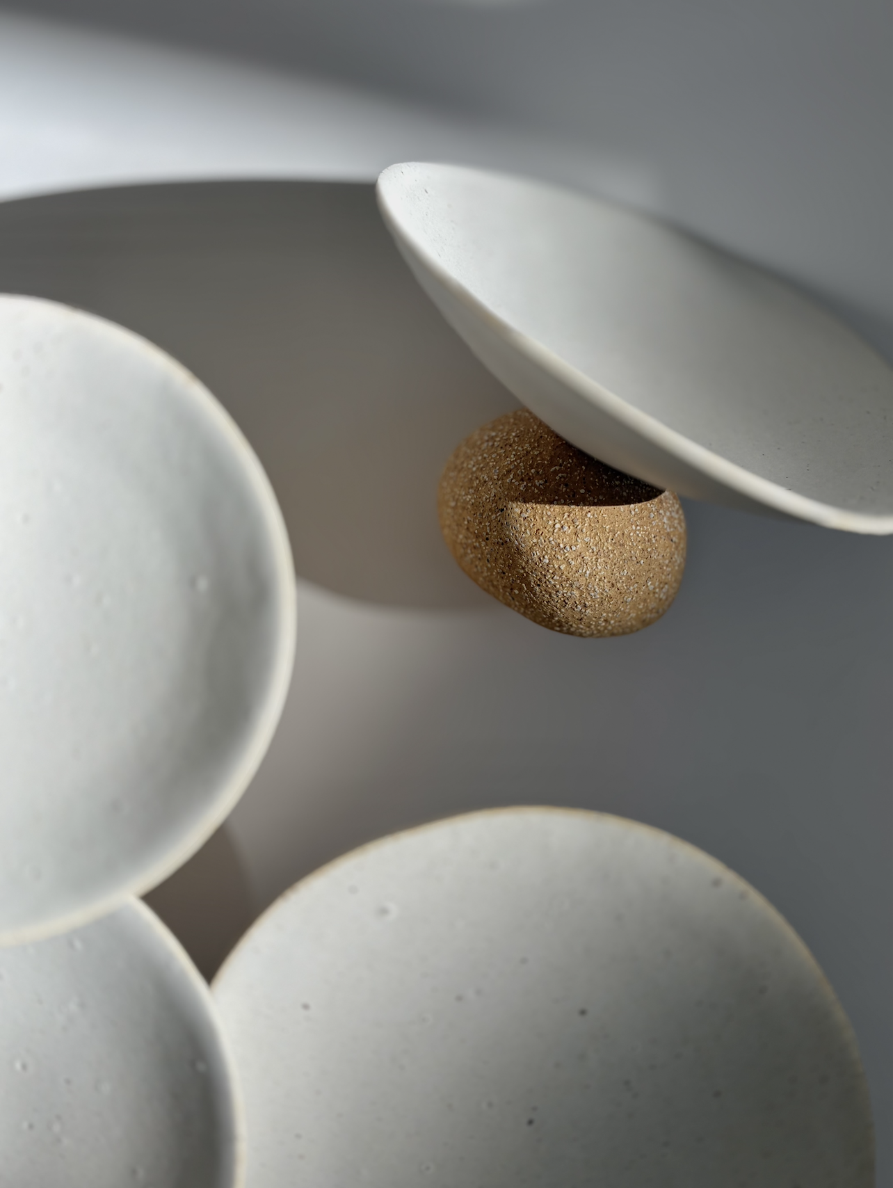 과거 장작 가마에서 사용되던 거친 흙에 주목해, 소모되던 재료가 매끈한 도자와 공존하는 구조를 만든다. 자갈을 닮은 하부와 기물의 몸체는 소성 과정에서 유약을 통해 하나로 결합되며, 형태는 자라나듯 안정적으로 완성된다. 완성된 기물은 거칠고 투박한 질감 속에서 정제된 아름다움을 드러낸다.