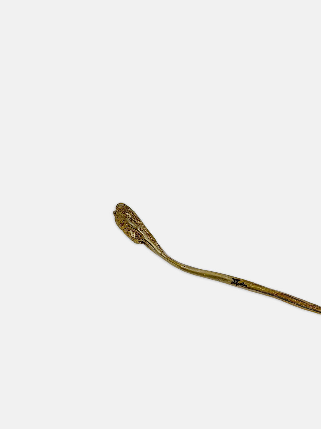 고사리의 말린 줄기에서 영감을 받은 형태의 황동 차시입니다.