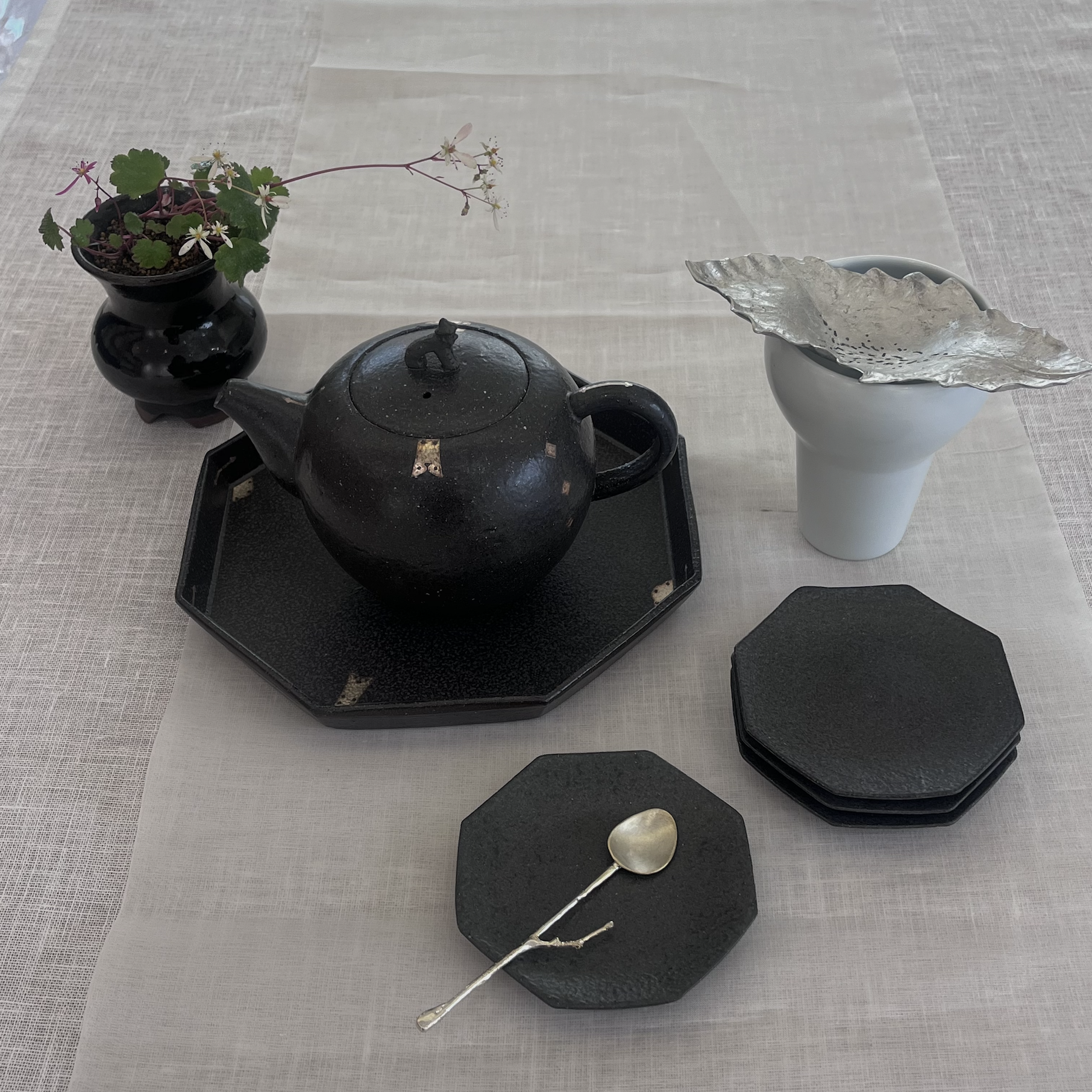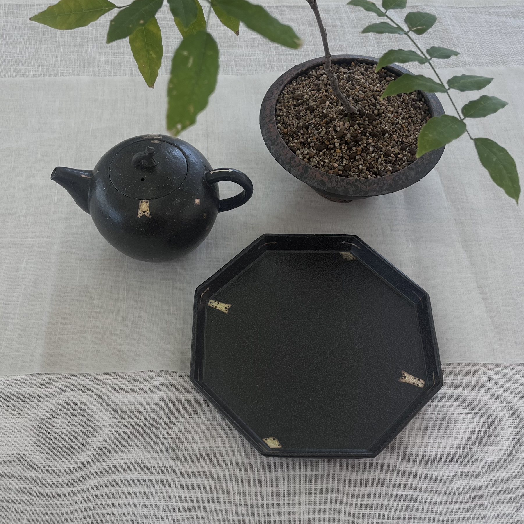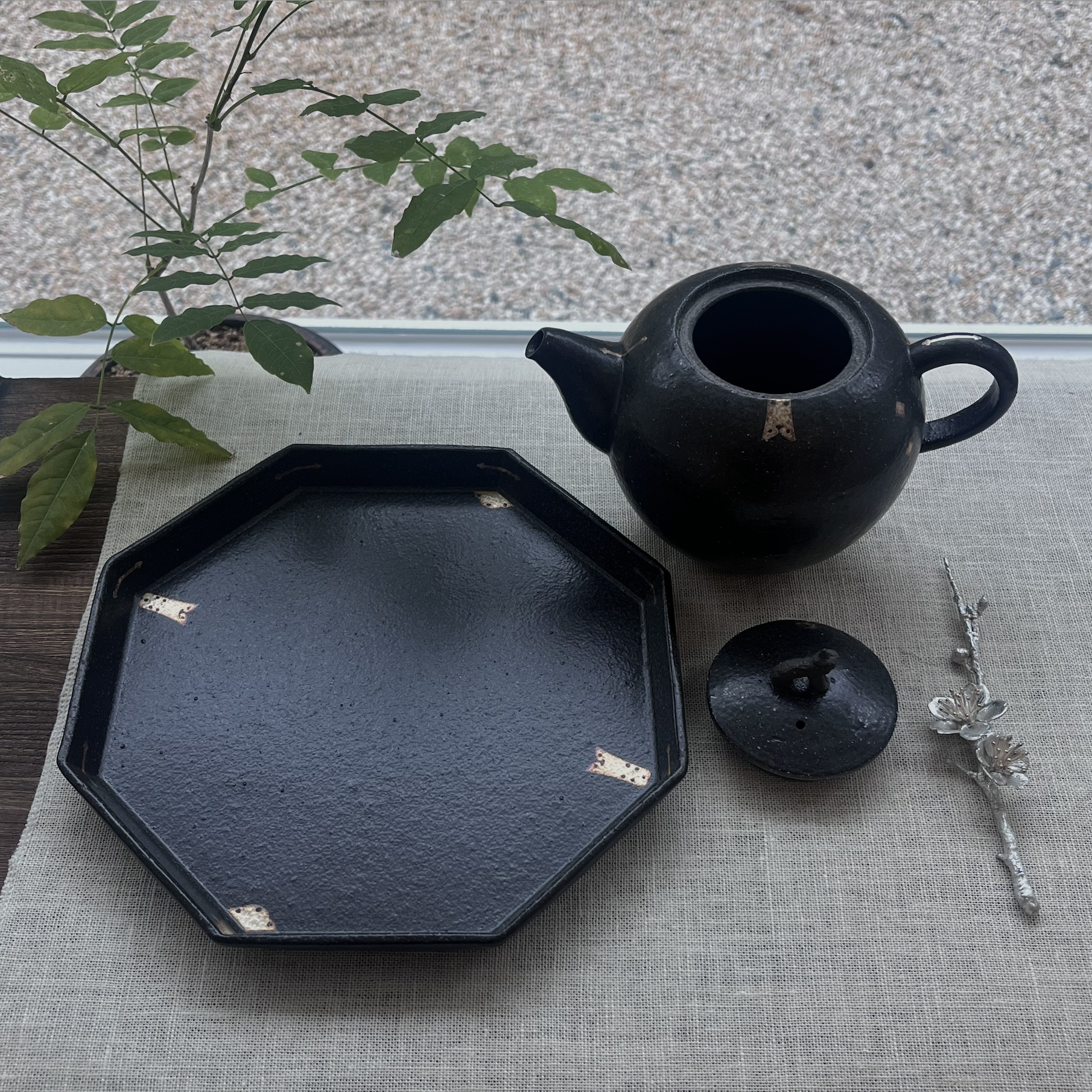 우아한 장석문이 아름답게 그려진 검은색 다관과 팔각접시 세트입니다.